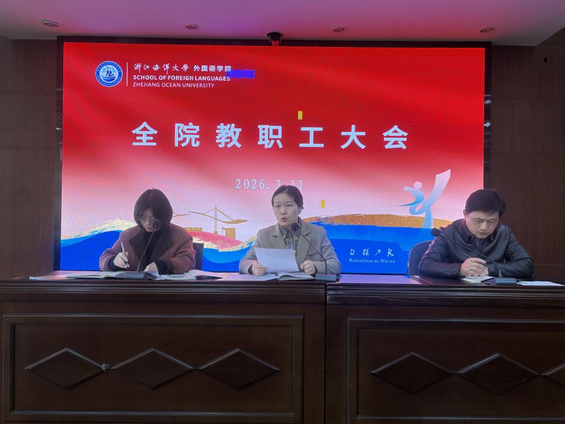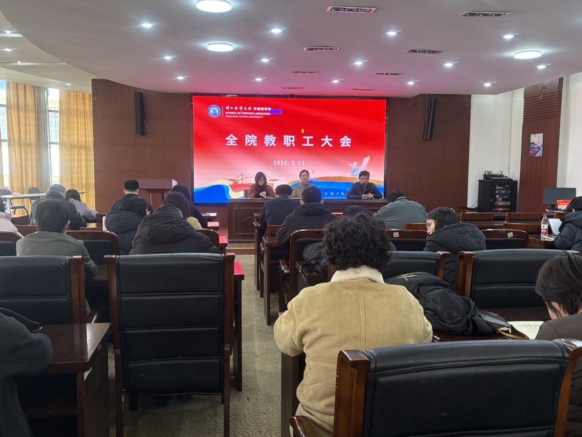 学院院长钟伟良围绕学校“学科攀登一号工程”,从四方面布置了新学期具体工作。教学上严抓课堂质量,推进“外语+海洋”融合课程建设,完成2026版人才培养方案修订调整;科研上聚焦海洋文化等特色方向,全力推进MTI专硕申报,丰富微专业建设;人才培养上紧盯毕业生就业与毕业论文质量,明确各时间节点要求;队伍建设上积极开展人才引进和青年教师学历提升。她同时强调教职工严守纪律、恪守师德。