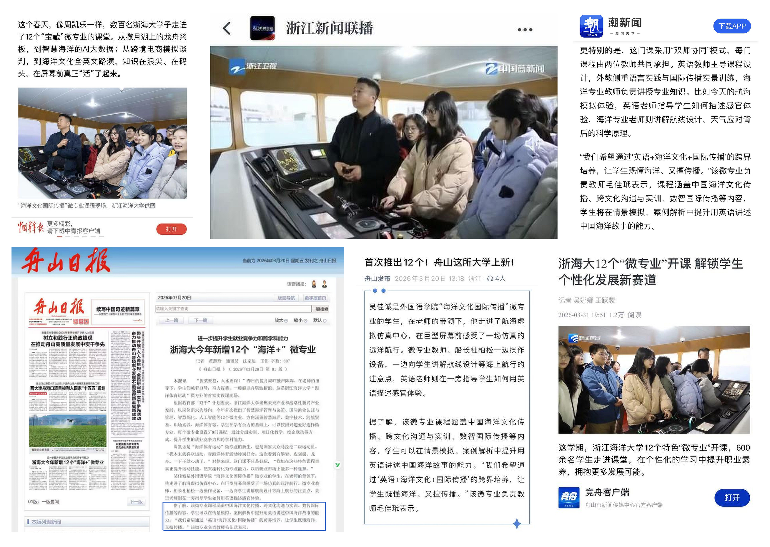 近日,我院 2026 年春季学期全新开设的海洋文化国际传播与跨境电子商务两个微专业,受到权威媒体高度关注。《中国青年报》、浙江新闻联播、潮新闻、《舟山日报》等多家权威媒体先后刊发报道,高度认可我院立足海洋特色、深耕“外语+”复合型人才培育的创新举措。