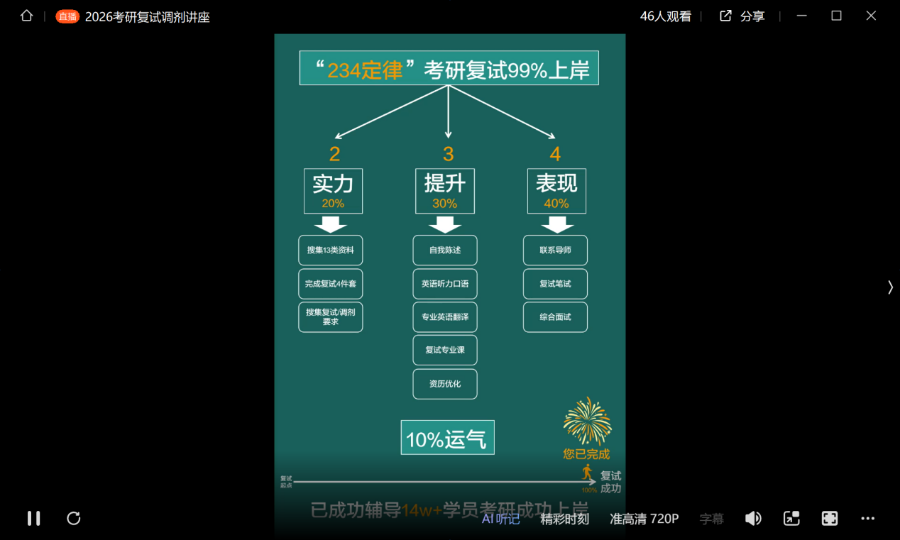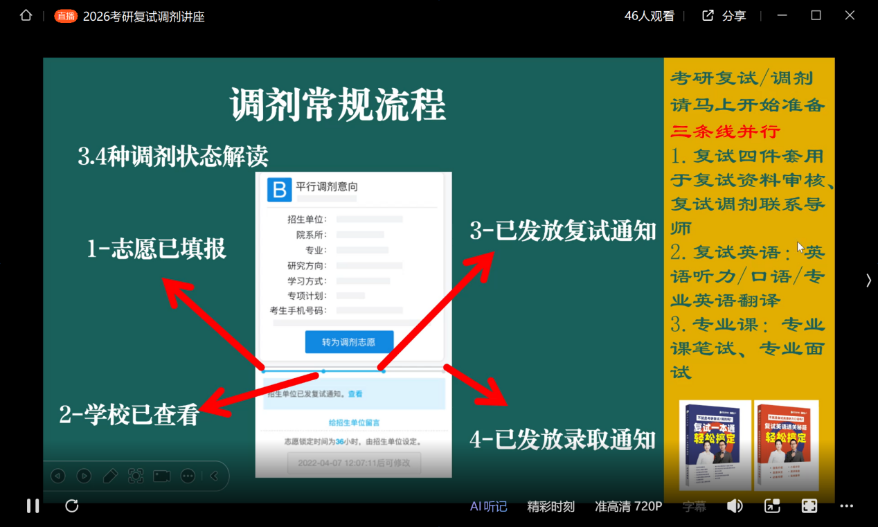 本次讲座特邀拥有10年升学规划经验的孙吉老师主讲,围绕复试全流程解读、复试专业课能力梳理、调剂流程详解三大核心内容展开。讲座中,孙老师细致拆解复试大纲,分享邮件模板、中英文个人简历、自荐信等材料的优化技巧,针对复试英语听力口语、专业英语翻译等重点模块给出备考建议;同时清晰梳理调剂基本要求、申请条件与常规流程,解读调剂系统开放时间、志愿填报规则及状态变化等关键信息,为学子们的复试与调剂备考指明方向。